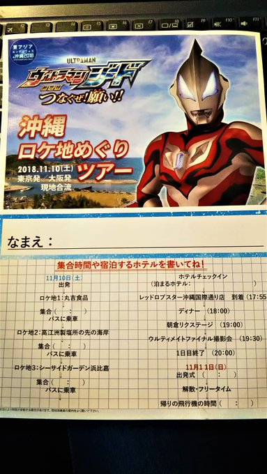ウルトラマンジード沖縄ロケ地巡りツアーレポ一日目。 ウルトラマン 2018年11月10日 ※ツイッターの呟きをほぼそのまま載せています。 羽田空港組でした。朝早い。緊張しすぎてあんまり眠れなかった。途中間違って逆方向の電車に乗るポカをやらかすも無事に羽田に到着。荷物預けたり並んでる飛行機見たりあれこれしてるうちに沖縄へ。お隣に座っていた方とちょろっとお話させてもらいました。 無事に沖縄へ到着。天気は曇り。東京よりもさすがに暑かったけど風もありとても過ごしやすい気温でした。我々羽田組はバスの2号車に乗り込みます。頂いたパンフレットがめちゃくちゃ凝ってた。こんな感じで簡単なミッションとかもあったよ。 途中休憩を挟みつつ浜比嘉島へ。第一の目的地である丸吉食品さんへ。沖縄的な一軒家のお店でした。ここでちょっと遅めの昼食。出されたご飯がどれもすごく美味しかった!個人的に沖縄そばが今まで食べた中で一番美味しかった。あとテーブルにミッションの写真もありました。 こちらがリクくんたちが座っていたテーブル。後ろにはジャグさんが座っていたカウンターがあります。ここでもずくコロッケも注文出来るけどお腹いっぱいだったので食べれなかった…。道路を挟んだ先にはカットされたリクくんのシーンの場所もあります(もうちょい左だった) ここから大きなバスからマイクロバスに乗り換えて移動。高江洲製塩所さんへ。行くまでがものすごい酷道!めっちゃがたがた揺れてた。まずはどうやって塩が出来上がるのか説明を受けます。説明してくれた方がものすごく面白かった。 ちなみに上から海水を落とし、竹ぼうき?っぽいところに塩を付着させているのだそうです。そしてまた下に落ちた海水を再びポンプを使って巡回させているそうです。台風や湿度の関係で夏よりも冬の方が塩は作りやすいとのこと。どうやら製塩の体験も出来るみたいです。 そして製塩所さんの先に海岸が。行くまでの小道が結構険しかった。メイキングでモアちゃんが危ないって言いながら歩いてたのが良く分かった。ていうかリクくんここ走ったの結構すごいと思う。 海岸。アイルさんに案内されてリクくんとモアちゃんがキャッキャウフフしてた砂浜。海が澄んでいてとても綺麗!砂がさらっさらで足が沈む!やどかりいっぱい! UFZの面々とリクくんたちが最後の別れの挨拶をしていたところ。アイルさんの幻影が映ってたのもここだと思います。最初のアイルさんがやって来たシーン以外の海のシーンは恐らくここで撮影されたっぽい?反対側はレイトさんがお土産ー!していたり、リクくんが寝転がっていたところ。 この次はシーサイドガーデン浜比嘉へ。ものすごい自然!崖!険しい道!少し歩いた先の小高いところにグクルシーサーの石像が置かれた場所があります。自然が多かったので結構蚊に刺されました。さほど痒くなかったけど…。 そして坂の途中に本物のシーサーがいました。そして着いた先にはグクルシーサーが!まさか置かれているとは思わなくてびっくりした。そしてどこからともなくお供えされるギガファイナライザー。ここも道が狭い上に結構急な坂でした。 グクルシーサーが置かれていた小さな洞穴の頭上はこんな感じ。珍しい地層になってました。それから一行がやってきた道。蛇とかもいるようなので上の方に一人で行くのは危ないとガイドさんが言ってました。 マングローブ。ハイビスカスも咲いてました。ここから少し歩いた先にもうひとつのロケ地が。 ミルク門。過去にアイルさんがお祈りをしている沖縄の人たちに遭遇したシーンの場所。思っていたよりも狭かった。説明にはアイルさんが語っていたアマミキヨとシネリキヨの名前も。 ミルク門から帰る途中で急に「絆の力!お借りします!オーブトリニティ!」という叫び声が聞こえてきてびっくりした。良く見てみたらグクルシーサーが置かれてたところにリクくんが!サプライズの登場に本当にびっくりした…。 ちなみに自分たちは一番最後だったらしく、今日一日はSNSに書かずに内緒にしといてね!と言われました(他のツアーの方々にもお願いしてました)めちゃくちゃリクくんが近かった…背が高かった…かわいかった…。 帰りのバスで劇場版のDVDを見ていたんですが、みんなお喋りしながら見てたのに、例のガイさんのシーンになると黙ってしまって面白かった。お子まで黙る。気持ちは分かる。あとバスガイドさんのお土産ぶっちゃけ話が最高でした。 そのあとは再びバスに乗り込みホテルへ。羽田組は国際通りすぐにあるホテルロイヤルオリオンさんに宿泊しました。ものすごく部屋が綺麗!大きい!あと窓から例のバリってる琉銀ロボが見れて興奮してしまった…お隣が夕食会場のレッドロブスターです。 チェックインし荷物整理をして、お向かいにあるレッドロブスターさんへ。入り口でジードくんがお出迎えしてくれてハイタッチしました!その後もしばらくお子たちと戯れたりして