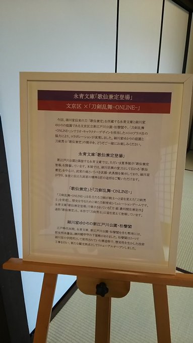 歌仙兼定を見に行ってきました。 刀剣乱舞 2016年07月13日 どうも菌です。今回は歌仙兼定を見に行ってきました。今回は主催の永青文庫さんがかなり気合を入れてコラボ等を行っているみたいなのでとても楽しみです。というわけで、朝から目白駅へ向かいます。気合を入れすぎてしまったのか、開館よりもかなり早く来てしまったので、ちょっと寄り道をしていくことにしました。ちなみにこの日はめちゃくちゃ蒸し暑かったで、涼をとりたいというのもありました。 というわけで訪れたのは、すぐ近くにあるホテル椿山荘です。名前は以前から知っていたのですが訪れるのは今回が初めてです。というより、目白駅に降りること自体が初めてでした。あまりにも豪華すぎるホテルの内装にビビって、ソファーに座ることすら躊躇してしまうレベルでした。あと廊下でアロマがたかれていました。めちゃくちゃいいにおいだった…。 本当はホテルでオシャレに朝食でもしたかったのですが、一番安いモーニングですら3000円という値段に目玉が飛び出そうになったので止めました。貧乏人にはちょっとつらすぎる。というわけで今回は素直に諦めました。お給料日直後なら、何とかなるかなあ…。 そのあとはホテルの目の前にあるカテドラル関口教会へと行ってみました。何でもとても珍しい様式の大聖堂が見れるとか。ちなみに中の大聖堂は撮影不可だったので、ポストカードを購入しました。 自分はキリスト教徒ではないし、あまり教会というものに縁が無かったのですが、内部はとても広く綺麗でした。特に中央の祭壇と、背後にある巨大なパイプオルガンが素晴らしかったです。中に展示されている彫刻や洗礼室などもここの長い歴史を感じさせるものでした。 購入したポストカードです。中はこんな感じで、屋根も十字型になっています。ちなみに一枚100円くらいなので、中を見学させて頂いた分の寄付としてもちょうど良いかもしれません。お土産にもなりますしね。 外に関しては撮影不可では無かったので、何枚か撮影させて頂きました。下の洞窟のようなものは、フランスのルルドという、由緒ある洞窟をそっくりに作ったものだそうです。 教会を見学し終わったら、ちょうどよく永青文庫の開館時間になったので、そそくさと向かいます。その日は平日でしたが、結構人が多かったです。入口にてチケットを購入し、いざ歌仙の元へ向かいます。彼が待つのは一番上の階なので、そこまで階段で登って行きました。刀剣が展示されているブースはやや混んでいたものの、10分弱くらいで歌仙まで辿り着けました。 実際に見た歌仙はとても綺麗でした。ですが良く見てみると細かい傷がたくさんあり、名前の由来であるエピソードを髣髴とさせてやっぱり彼の主は色んな意味で凄かったんだなあと、そんな感想を抱いてしまいました。きっと研ぐだけでは直せない傷なんだろうなあ。拵えもあまり見たことが無いオシャレなもので、しかも忠興本人が作成を指示したものだとか。歌仙の雅と風流を愛するところはここら辺から来ているのでしょうね。 ちなみに歌仙以外で気になった刀は海賊と呼ばれる太刀です。やっぱり刀は豪快で大き目がいいですね!自分はそういうのが大好きです。しかし、何故海賊って呼ばれているんだろう。不思議です。 歌仙や他の刀剣、そして細川家の逸品を楽しんだので、永青文庫の入口で作品保護のための寄付をしました。一口500円からで、寄付をした人には歌仙や細川家所蔵の刀剣シールがもらえるそうです。このシール、ものすごく凝っています。永青文庫の本気が見られるので、是非寄付をしましょう。 ひとしきり永青文庫を楽しんだので、次は歌仙兼定のパネルがある新江戸川公園の松聲閣へと向かいます。ちなみにここ、永青文庫からだとかなり急な坂を降りなければならないので、かなり大変です。サンダルなどで行くのはちょっと危険なので、履き慣れた靴を用意した方がいいです。しかもその日は小雨も降ったりしていたので、なおさら危険でした。そうでなくても、この辺りは坂が多くて、かなり体力を使います。ご注意を。 新江戸川公園と松聲閣の入口の写真です。公園は小ぢんまりとした規模ですが、とても綺麗に手入れされている印象でした。どうやら野鳥なども良く訪れるみたいです。もう少し天気が良かったら、ゆっくりと公園を散歩出来たのになあ。 というわけで、歌仙とご対面です。今日の彼は松聲閣の二階に居を構えていました。パネルは想像よりも大きかったです。書き下ろしのイラストも綺麗で凛々しくかっこいい!このイラストがグッズになるようなので、とても楽しみです。 水分補給と休憩も兼ねて、松聲閣さんでお抹茶を頂きました。添えられているお菓子は加勢以多っていう細川家が幕府にも献上したことがある由緒あるお菓子なのだそうです。かりんを使ったお菓子らしく、甘酸っぱくてとても美味しかったです。ごちそうさまでした