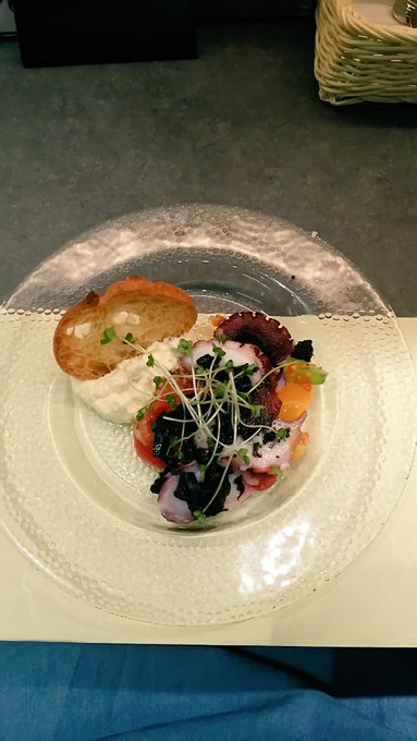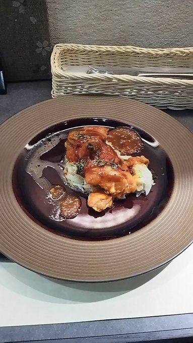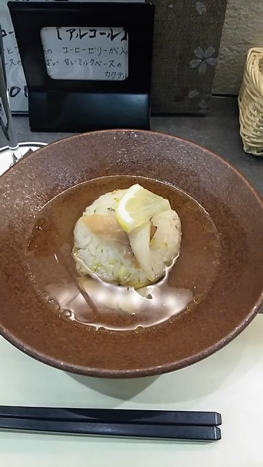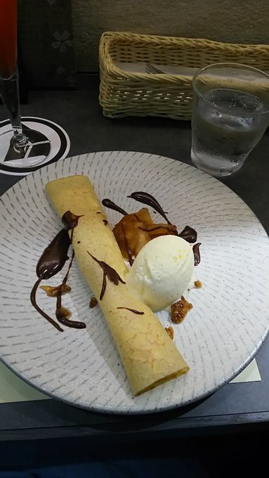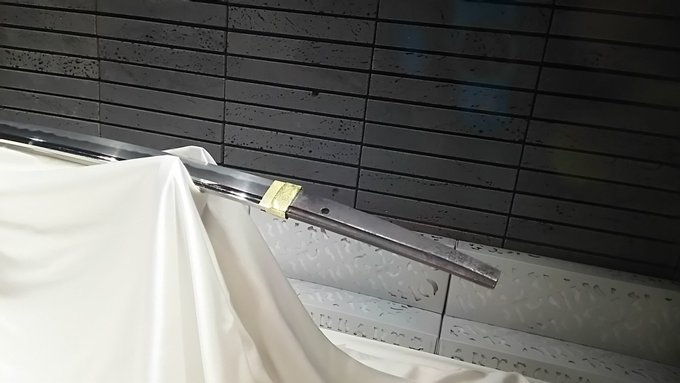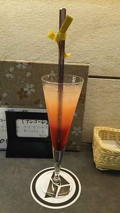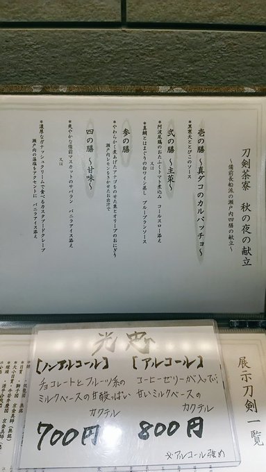 刀剣茶寮に行ってきました。 刀剣乱舞 2016年09月16日 どうも菌です。今日は刀剣茶寮へ行ってきました。何とこちらで特別に光忠の太刀が展示されるとのこと。今回限りのコラボドリンクなどもあるようなので、これは行かなければと再び予約をしてみました。以前行ったときのご飯がとても美味しかったので、今回のディナーメニューもとても期待出来そうです。というわけで、いつもの如く仕事の後に秋葉原に向かいます。 というわけでやってまいりましたよ!そして今回のメニューです。光忠の展示に合わせて長船派にまつわるメニューのようです。下のドリンクもなかなか良さげ。楽しみ!とりあえず注文を終わらせて、店内を見てみることにします。 以前はメインとして飾られていた秋葉原くんは光忠にスペースを譲っていました。相変わらず鞘の細工がとても綺麗。 そして今回のメイン、光忠です。奥のスペースに鎮座していました。すらりとした刀身ですごくきれいだった…!長船派の刀はあまり意識して見たことが無かったのでまじまじと見てしまいました。 それから大和守安定です。刀剣乱舞のものと同名ですが、他の刀剣と同じく別物のようです。この安定はあまり反りがない珍しい刀でした。他にも刀剣がいくつか展示されていましたが、以前に撮影したものなので今回は除外しました。 というわけでそうこうしているうちにご飯が来ましたよ!前菜のタコのカルパッチョです。下にカラフルなプチトマトが敷いてあります。実はプチトマトはあまり得意ではないのですが、ソースのおかげなのか新鮮だからなのかこれは美味しく食べれました。それから一緒に来た光忠のドリンクはチョコレート味ですが、あまりしつこくなくご飯と一緒に飲んでも大丈夫でした。 次はお肉、阿波尾鶏のおたふくトマト煮込みです。下にマッシュポテトが敷いてあります。トマトの酸味が効いていてとても美味しい!ポテトもあるので思ったよりもボリュームがありました。 次はご飯、アナゴを乗せたオリーブと栗のおにぎりです。これは出汁をかけて食べるお茶漬けみたいなものだそうです。見た目さっぱりしてそうですが意外と塩辛く、かつレモンの風味が効いていてとても美味しかったです。今回のメニューで個人的にこれが一番の大ヒットでした。それから光忠を飲み終わってしまったので、堀川くんのノンアルコールカクテルを追加注文しました。 そして〆のデザート、ガナッシュクリームで食べるカスタードクレープです。添えられているりんごのコンポートがワンポイント。冷たいデザートでとても美味しかった!今回のご飯もどれもボリュームがあり美味しくて大満足でした。 期間限定の光忠も何とか見れて本当に良かったです。ご飯も安定して美味しいし素晴らしいお店だと思います。次も珍しい刀剣が展示されるようならば、また訪れたいなあ。時間の都合上ランチにはなかなか行けないので、機会があったらそっちにも行ってみたいものです。そんな感じ。ではでは、短いですがお疲れ様でした。