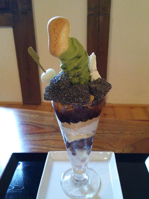 そのあとは近くにある御手杵パフェを出している真盛堂さんへ。とても綺麗な和風カフェで、自分は二階へ通されました。とても広々としていて明るく、しかも涼しい。そこでさっき会った先客の姿を見かける。やはりみんなルートは一緒か。店員さんに御手杵パフェ(さくらんぼ抜き)を頼みます。さくらんぼ食べれないんだ。すまんな。