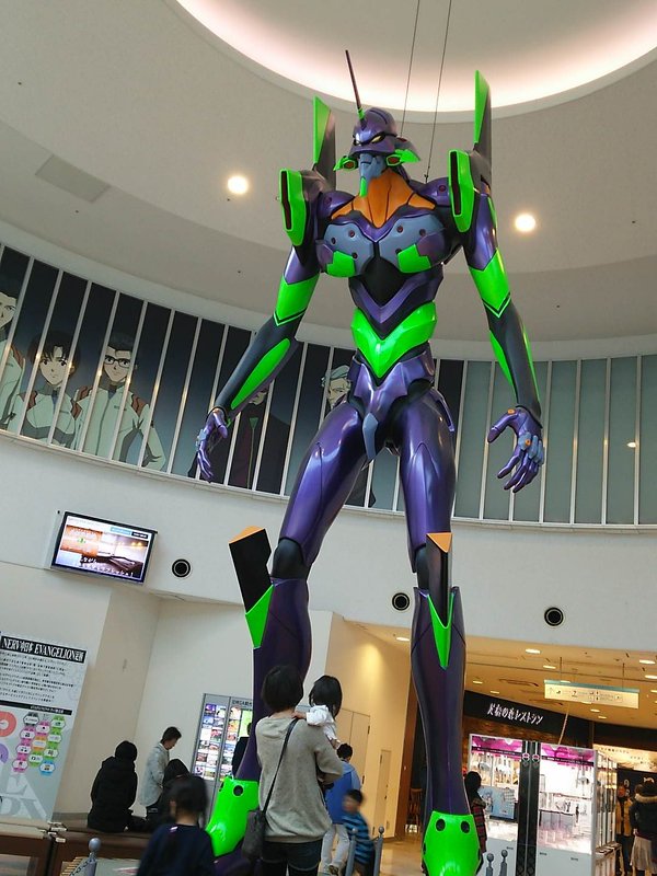 そのままぶらぶらと奥のホールっぽいところに進むと、巨大なエヴァ初号機がどーんと立っておりました。このフィギュアは等身大では無いようですが、かなりの大きさです。ホールの天井ギリギリくらいの大きさでした。しかも足の間を通れるので、小さなお子様が楽しそうにその間を通り抜けていました。