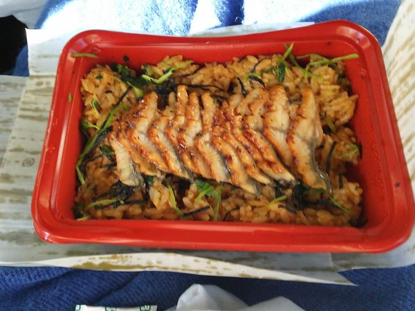 そしてその次に停まったのが浜名湖サービスエリア。浜名湖と言えばうなぎ!そう、うなぎです。ちょうど昼食の時間に到着したので、車内でも食べれるようなうなぎのお弁当を探します。でもこつこつ買い食いもしていたので、量がやや少なめでお手頃なのを…となるとなかなか難しい。というわけで、私とカナさんが購入したのはこちらのひつまぶし弁当でした。