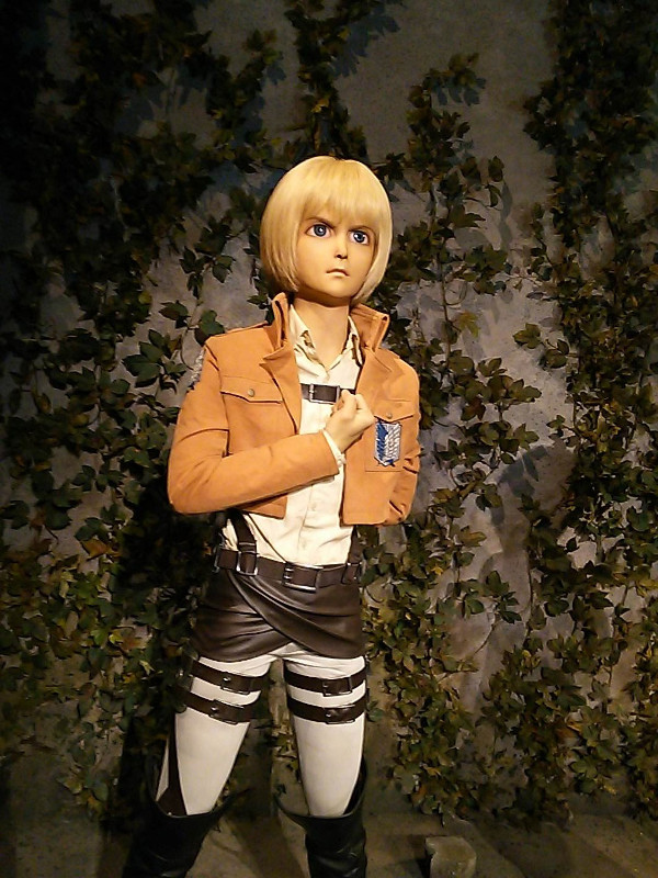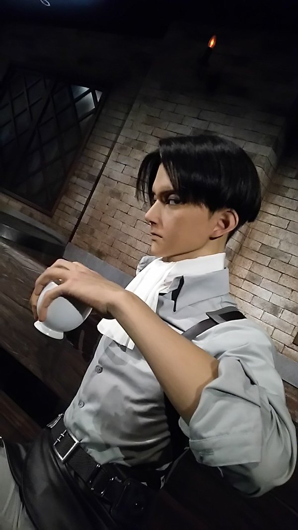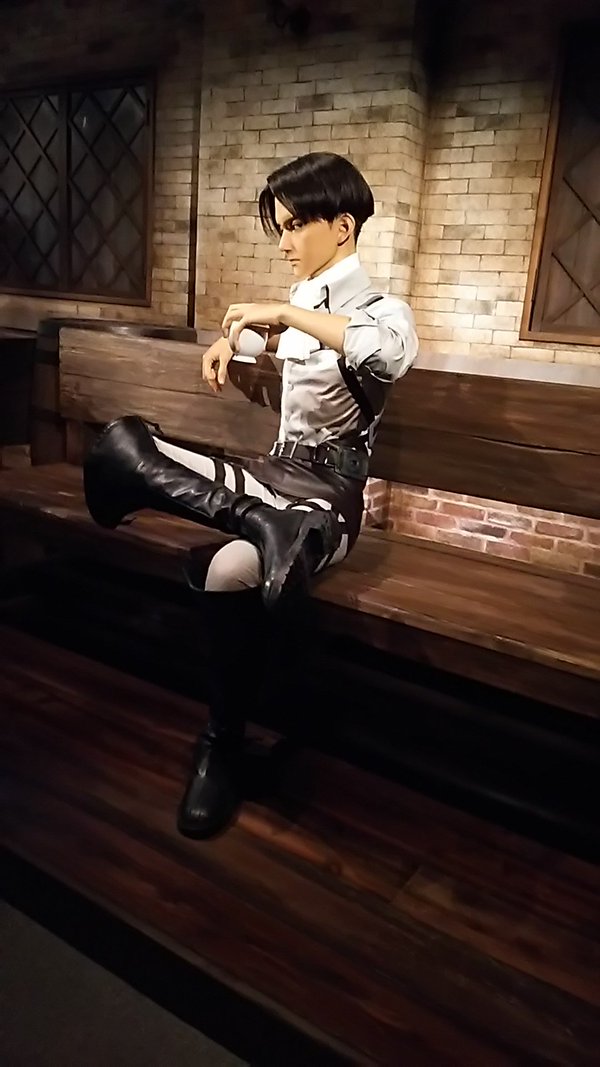 さっきの幼馴染三人組と対面する形で兵長がいらっしゃいます。ちなみにこのベンチ座れます。兵長とご一緒出来るのです。すごい。ただし兵長は綺麗好きなのでお手を触れないようにしてくださいと調査兵団の方々が注意していました。この注意の仕方がすごく雰囲気が出てて好きです。自分は恥ずかしかったので兵長オンリーで撮影させて頂きました。兵長何気に足がとても長い…かっこいい…。