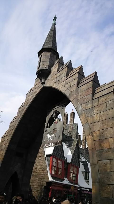 ショーをひとしきり楽しんだら、ちょうど入場時間になりました。そそくさとハリポタエリアの入口へ向かいます。相変わらず入口周辺は人が多い!その人の流れに乗って、ゆっくりゆっくりと中へ進んで行きます。気分は魔法使いの学生です。年齢的にもう学生じゃないんですけども。