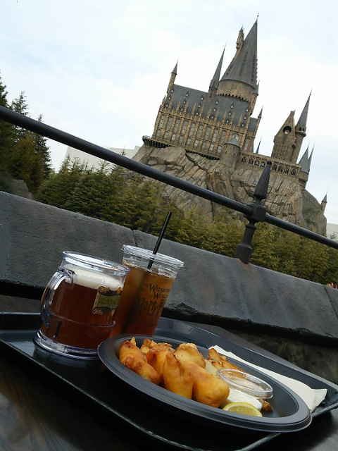 はてさて城内もひとしきり楽しんだので、小腹を満たすためにレストラン「三本の箒」へと向かいます。そこでフィッシュ&チップスと、バタービールとアイスティーを頼みました。珍しく屋外に案内されたので、ロケーションの良さそうな場所を選んでみました。