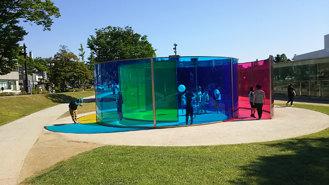 次に向かったのは金沢21世紀美術館です。美術館も兼六園も金沢城もここも徒歩圏内にあるため、まとめて回れるのでとてもありがたかったりします。ここの美術館の敷地内には、こういった触れたり出来る作品が点在していました。説明では比較的若手の芸術家さんたちの作品を集めた美術館のようなので、こういった作品が多いのかもしれません。