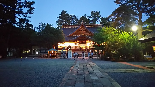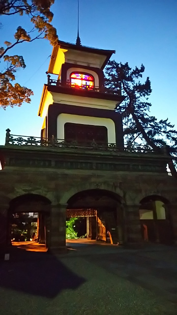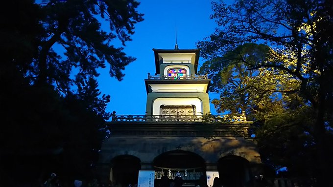 香林坊の通り道に尾山神社があったので、参拝することにしました。この神社は前田利家とその妻のおまつの方を祀った神社なのだそうです。カラフルなステンドグラスが張られた門は国の重要文化財にもなっているようです。夜だと明かりが一層綺麗に輝いていました。慣れない手つきでお参りをし、再び香林坊まで歩いていきます。お祭りの影響なのか、ここから香林坊までずっと屋台がずらりと並んでいました。