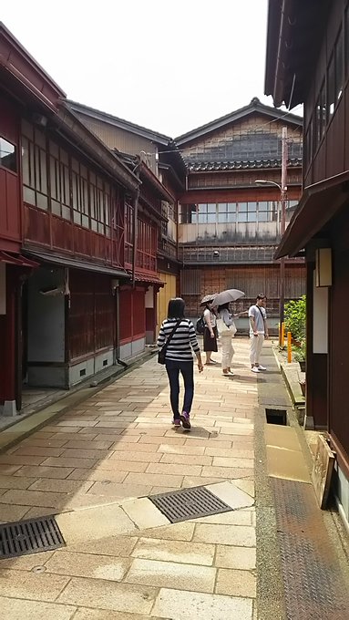 次はまたバスに乗り、ひがし茶屋街へと向かいます。こちらは茶屋様式、と呼ばれる家屋がたくさん残されている街なのだそうです。京都にある街並みとよく似たもの、というとおおざっぱかもしれませんが、恐らく似たようなものだと思います。